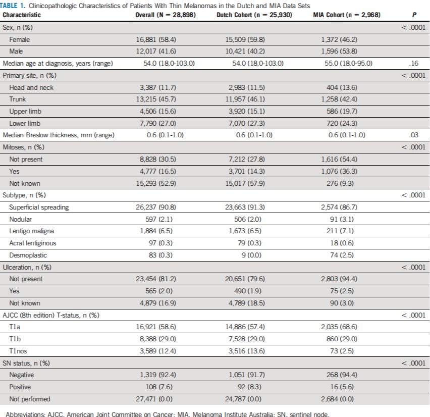 表1.荷兰和MIA数据集中薄黑色素瘤患者的临床病理特征