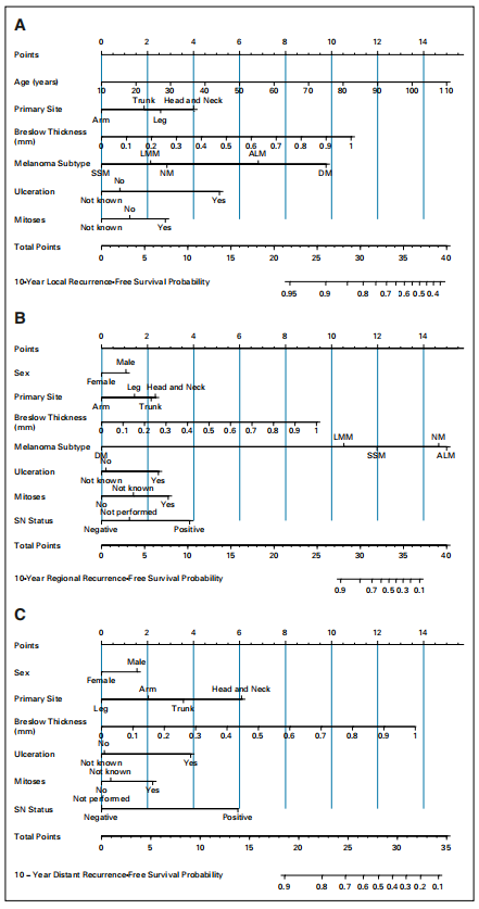 图2.列线图预测薄黑色素瘤患者LRFS(A),RRFS(B),DRFS(C)。