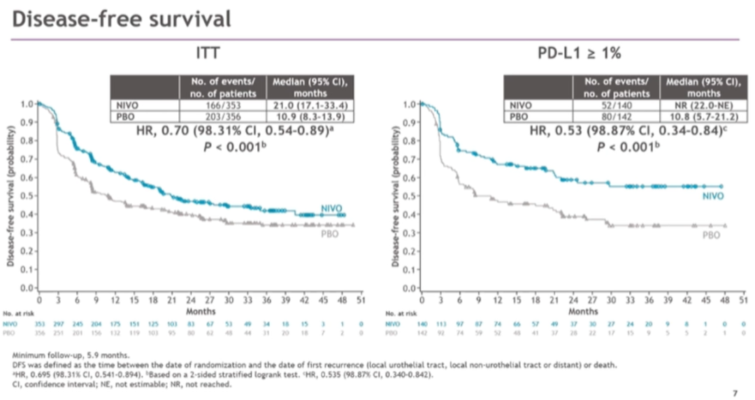 • ITT人群中,NIVO组相较于PBO组的DFS有显著延长(21.0 vs 10.9个月,HR 0.70,P<0.001)。