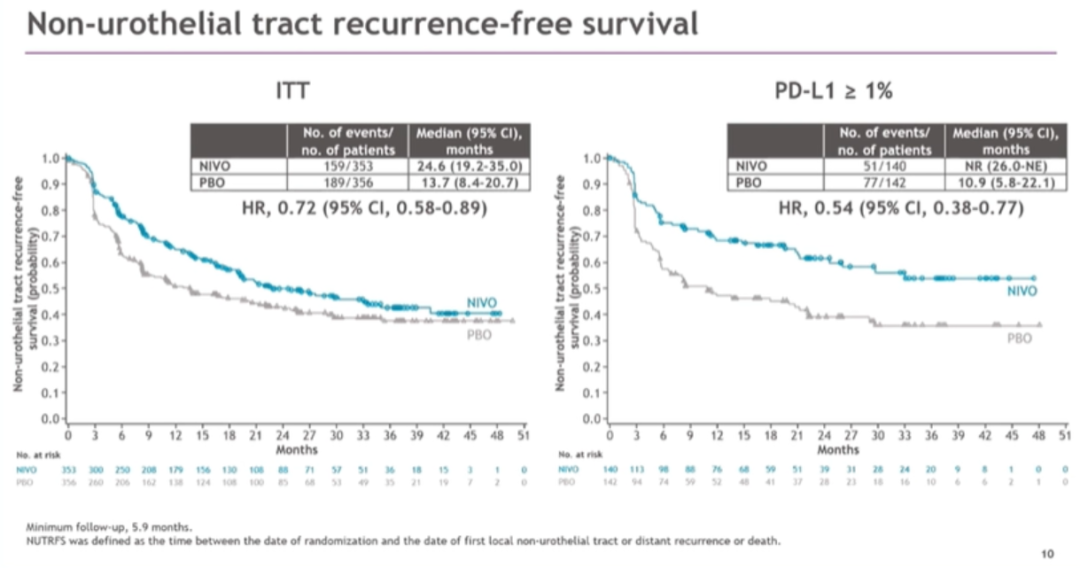 • ITT人群和PD-L1≥1%患者的非尿路复发风险分别降低28%(NUTRFS:24.6 vs 13.7个月,HR 0.72)和46%(NR vs 10.9个月,HR 0.54)。