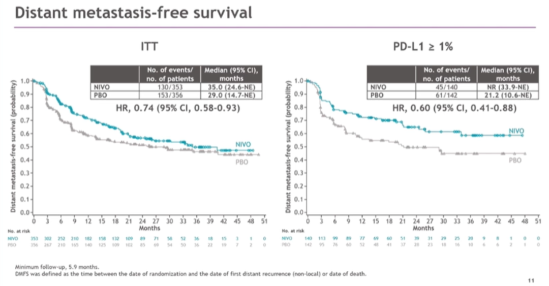 • ITT人群和PD-L1≥1%患者的远处转移风险分别降低28%(DSS:35.0 vs 29.0个月,HR 0.74)和46%(NR vs 21.2个月,HR 0.60)。