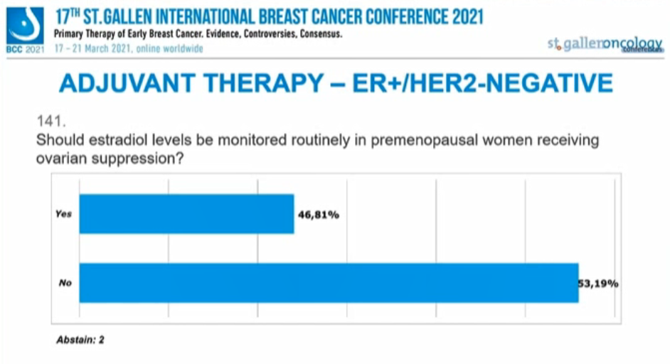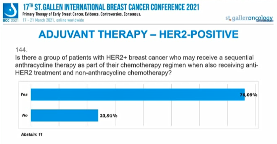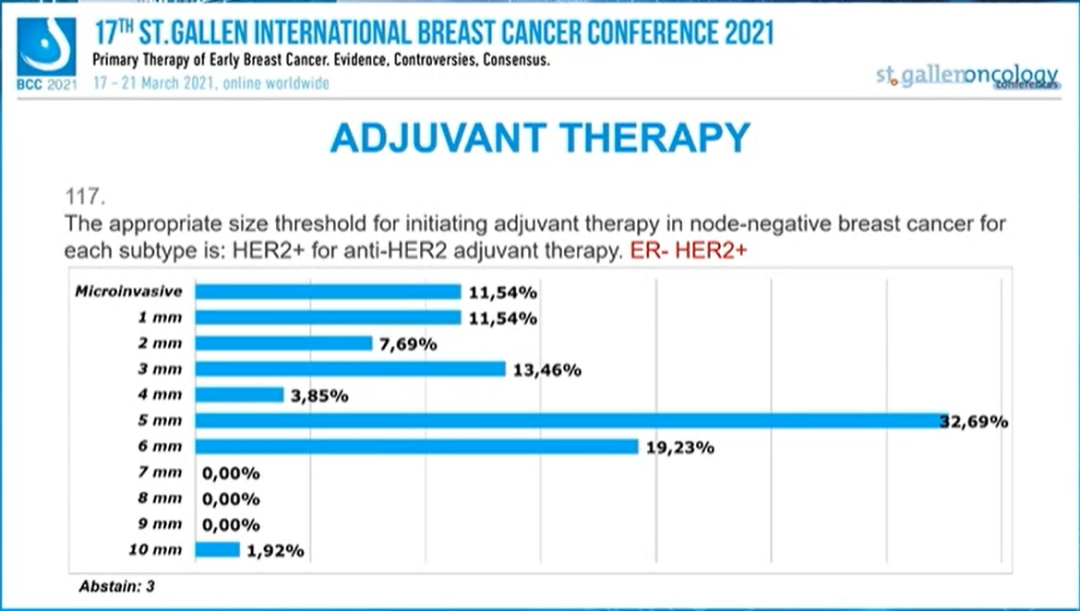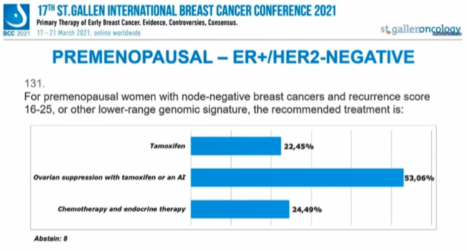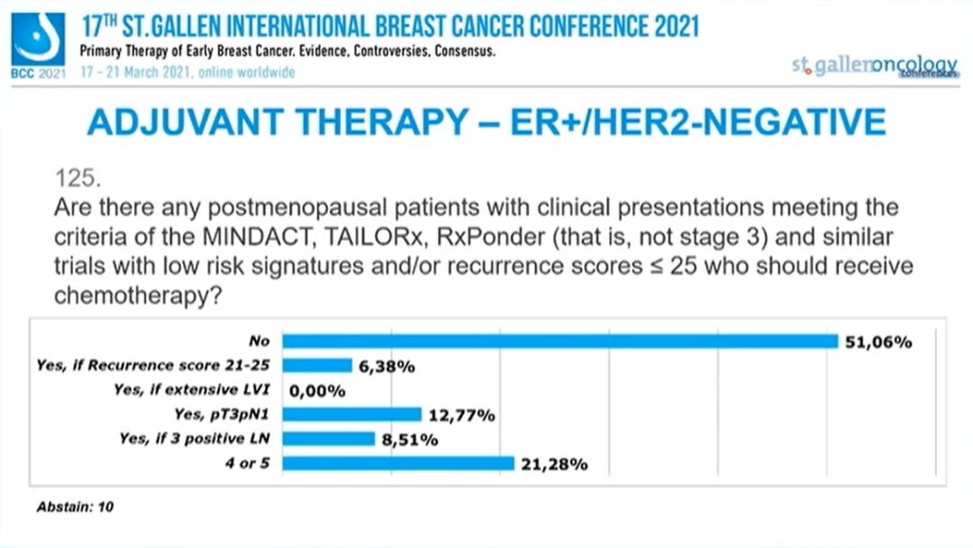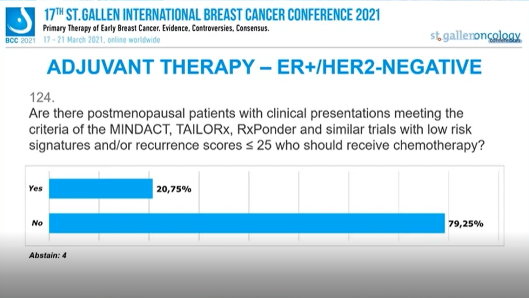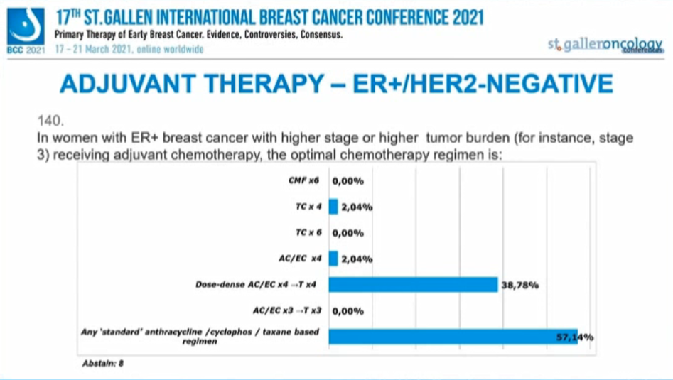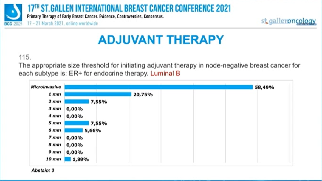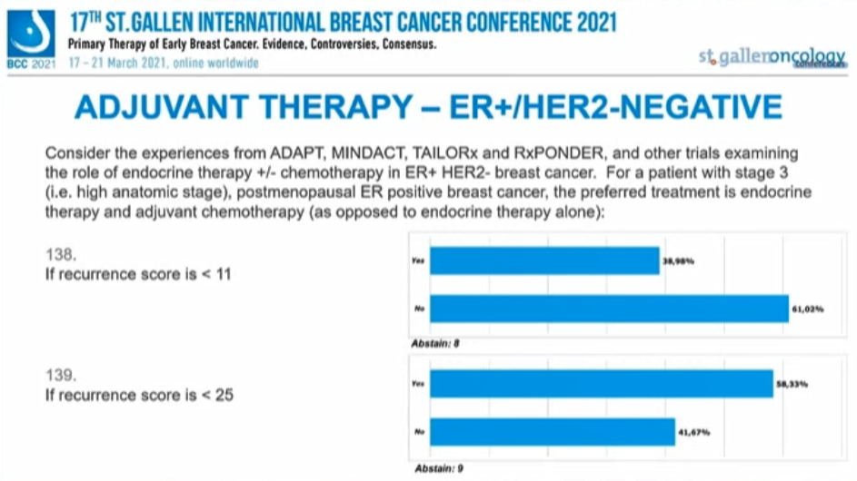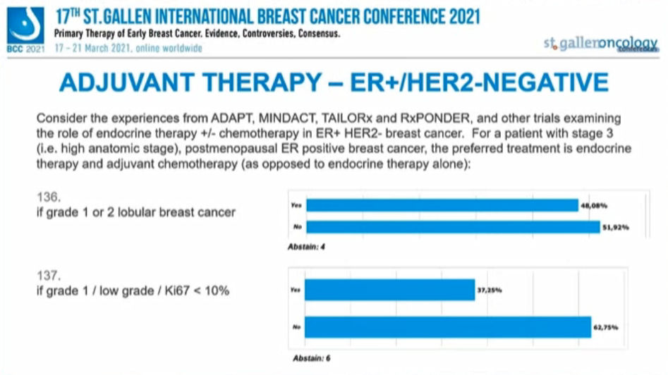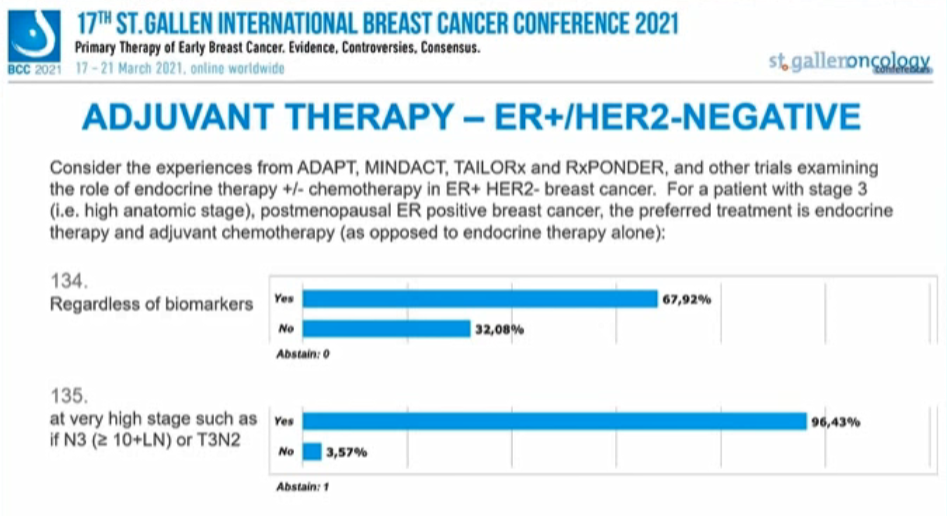 编者按:当地时间3月21日,在Eric Winer教授的主持下,第十七届圣加伦国际乳腺癌大会(SG-BCC 2021)的专家完成了投票,在早期乳腺癌系统治疗方面,昨天首场投票中已经讨论了新辅助治疗的策略,今天的讨论进一步总结“辅助治疗”,以及个亚型乳腺癌的辅助治疗策略。