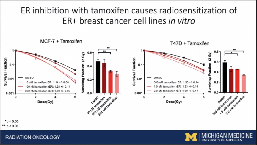 研究背景:雌激素受体(ER)的表达存在于75%左右的乳腺肿瘤中,并已被证明是肿瘤启动和进展的一个重要驱动因素。因此,ER+乳腺癌患者常需一线使用抑制ER及其下游通路的药物。电离辐射(RT)可显著改善乳腺癌患者的局部控制率及总体生存率。同样,内分泌治疗(ET)也可以改善乳腺癌患者的无转移率和总体生存率。尽管放疗和内分泌治疗都用于ER+乳腺癌患者,但内分泌治疗对肿瘤放疗敏感性的影响尚不清楚。