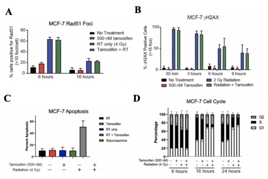 图2 他莫昔芬与RT联合MCF-7细胞DNA损伤同源重组修复(A&B)、细胞凋亡(C)、细胞周期(D)无显著变化
