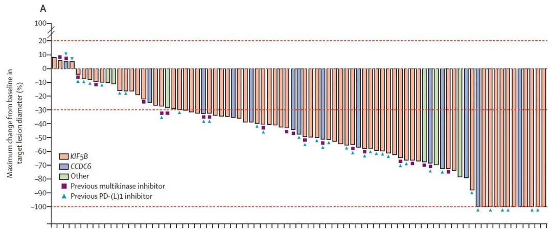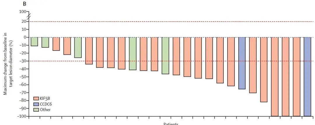 初治的患者的ORR为70%,包括11%的患者出现CR,不同RET融合伴侣均观察到疗效,中位响应持续时间9.0个月,所有患者均观察到瘤体出现不同程度的缩小(图2)。