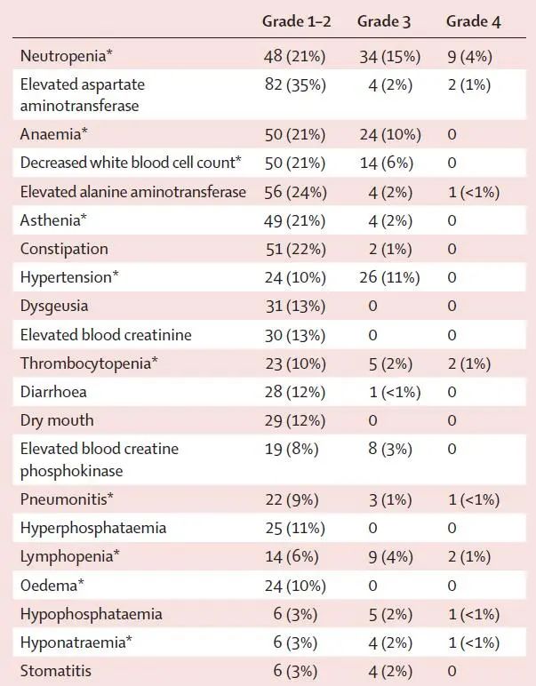 安全性:93%的患者出现任何级别的治疗相关不良反应,其中,3度及以上不良反应发生率为48%,最常见的为中性粒细胞下降18%、高血压11%和贫血10%,严重治疗相关不良反应发生率24%,38%的患者因治疗相关不良反应导致剂量降低,并有6%的患者永久性终止治疗。既往是否接受免疫检查点抑制剂治疗不影响患者安全谱(图4)。