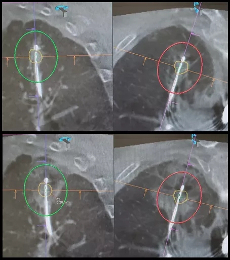经支气管微波消融(TBMA)融合了两个优势,其一,TBMA利用微波能量来形成更好的消融轮廓,并避免胸膜穿刺;其二,TBMA能够到达经皮消融难以到达或有风险的某些肺部区域,例如,靠近纵隔胸膜或横膈膜的区域、肺尖区域及被肩胛骨遮蔽的区域。我们研究所使用电磁导航支气管镜(ENB)技术引导TBMA,在复合手术室中使用定位工具,使用锥形束CT (CBCT)和荧光镜检查支持TBMA的实施。CBCT有助于准确确定消融区域,使消融区域充分覆盖肺结节。