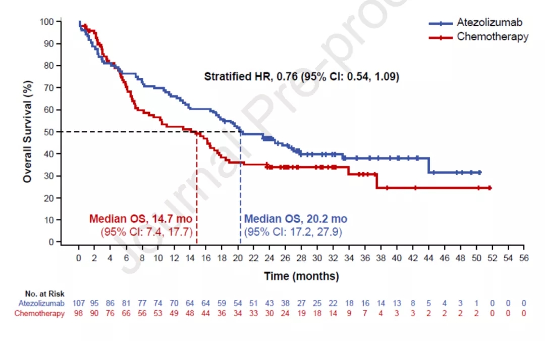 研究结果显示,共计572例患者接受随机化,免疫治疗组和化疗组分别入组285例和287例患者,18例携带驱动基因突变的患者被排除,因此,最终分析时,两组均有277例患者。在野生型人群中,PD-L1高表达患者比例分别为38.6%和35.4%;中-高表达的比例分别为59.9%和58.5%。全组患者中位随访时间达到31.3个月。在PD-L1中-高表达的患者中,阿替利珠单抗较化疗未能改善OS,两组中位OS分别为19.9个月和16.1个月,HR=0.87,因此,后续在PD-L1任意表达的患者中未进行正式统计分析,两组中位OS分别为18.9个月和14.7个月,HR=0.85;在PD-L1高表达人群中,两组中位OS分别为20.2个月和14.7个月,HR=0.76。