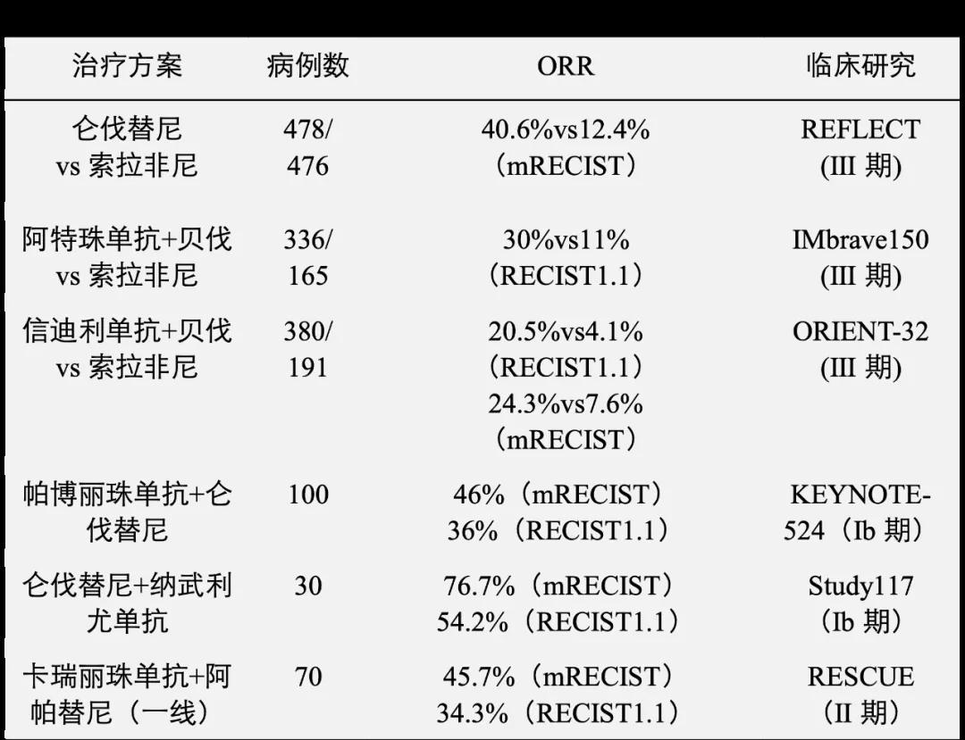 近年来,靶向治疗已经成为晚期肝癌一线治疗的新标准,比如REFLECT研究中,多靶点TKI仑伐替尼单药治疗的ORR可达24%,中位PFS(7.4 vs 3.7个月)和OS(13.6 vs 12.3个月)有不同程度改善。单独免疫治疗的疗效不满意,比如CheckMate 459研究中单独NIVO的ORR仅为15%。然而,在免疫基础上联合靶向治疗可以获得较好的疗效,比如KEYNOTE-524研究“可乐组合”(仑伐替尼+帕博利珠单抗)的ORR为36%,Study 117研究仑伐替尼+纳武利尤单抗的ORR达到了54.2%。