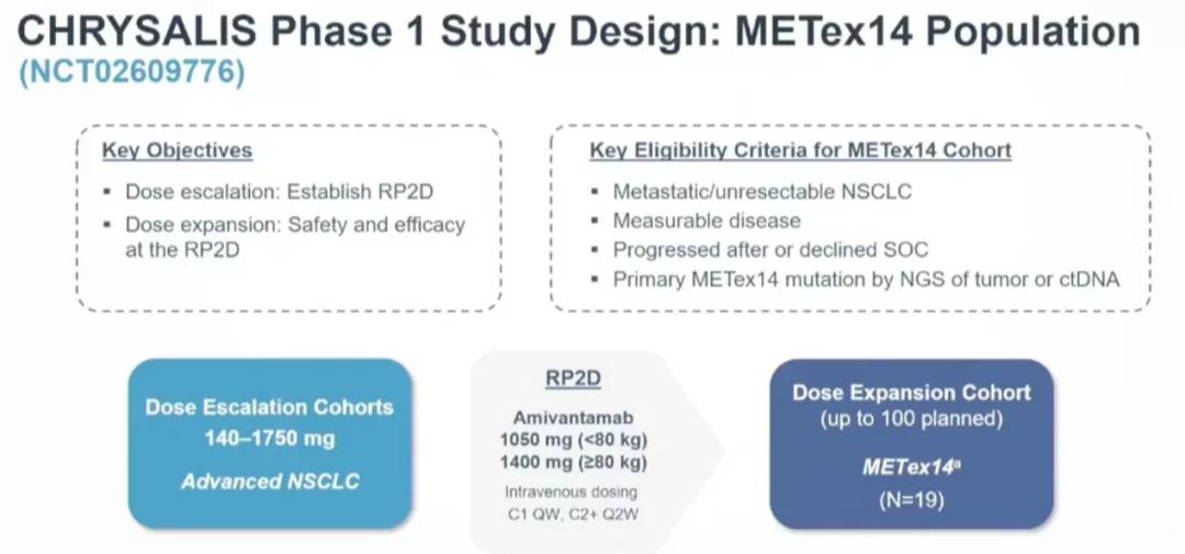 MET第14号外显子(ex14)跳跃突变在NSCLC中约占3%,以老年(>70岁)、女性、吸烟者多见。Amivantamab(JNJ-372)是一款人源化EGFR-MET双特异性抗体,可通过结合胞外段区域,促进受体-抗体复合物的降解,既往研究显示其对EGFR 20ins的晚期NSCLC具有一定疗效。今年WCLC公布了CHRYSALIS研究初步结果,该研究探索了Amivantamab治疗携带MET ex14跳跃突变晚期NSCLC患者的疗效及安全性。