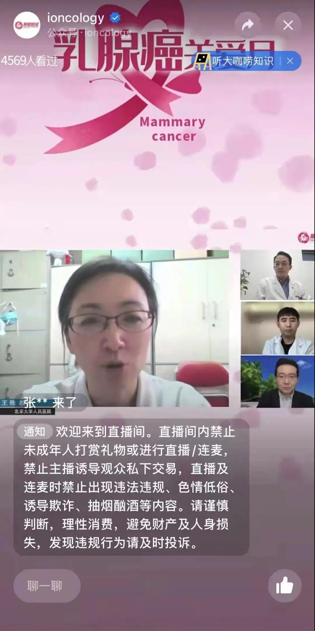 后记:11月10日(本周三)的话题讨论开始前,已有观众准时在直播间守候。在1个小时的直播中,近五千名观众同时在线观看,现场观众反应热烈,留言区质朴的语言纷纷对专家的耐心讲解表示感谢,并对下一场直播表示期待。凛冬将至,希望医护人员的关心和照护能助力乳腺癌患者驱散阴霾,成为走进其生命中的那束光,照亮人生道路!