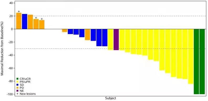 截至分析时间,共入组36名患者,中位年龄为 53.0 岁。其中有30名(83.3%)患者在复发转移阶段接受了2线以上的系统性治疗。入组患者中分别有33 和36名患者可评估疗效或安全性。目前ORR为48.5%(95% CI:30.8~66.5),有一名患者达到完全缓解(CR)。疾病控制率(DCR)为 78.8%(95% CI:61.1~91.0)。目前的中位PFS为 6.9(95% CI:4.2~未达到)月。