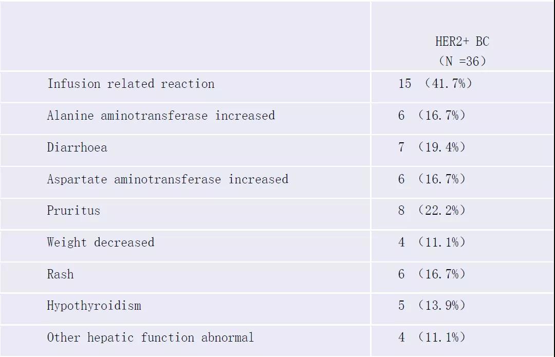 36名患者中有32名(88.9%)患者出现任何级别的治疗相关不良事件(TRAE),5名(13.9%)出现≥3级TRAE。最常见(≥10%)的TRAE是输液相关反应(41.7%)、瘙痒(22.2%)、腹泻(19.4%)、皮疹(16.7%)、丙氨酸转氨酶升高(16.7%)、天冬氨酸转氨酶升高(16.7%)、甲状腺功能减退症(13.9%)、体重下降(11.1%)、其他肝功能异常(11.1%)。截止分析时间没有观察到与治疗相关的死亡。
