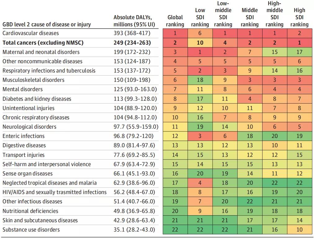 图1. 2019年癌症绝对残疾调整生命年(DALYs)在全球疾病负担(GBD)研究中的22个二级疾病类别中按社会人口指数(SDI)五分位数排名