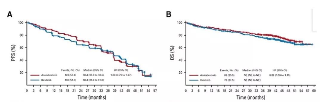 2021年7月,在JCO期刊上更新了ELEVATE-RRⅢ期非劣效性研究的结果,该研究对比了阿卡替尼(Acalabrutinib)和伊布替尼治疗复发难治CLL患者的疗效和安全性,共纳入533例具有高风险特征(存在17p缺失和/或11q缺失)的CLL患者,随机给予阿卡替尼和伊布替尼治疗。中位随访了40.9个月后结果显示:①两组的中位PFS均为38.4个月,Acalabrutinib确定不劣于依鲁替尼。两组的中位OS均未达到(详见下图)。②心房颤动或心房扑动的发生率分别为9.4%和16.0%3级以上感染发生率分别为30.8%和30.0%,Richter转化的发生率分别为3.8%和4.9%。