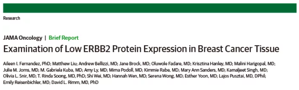 [1]Fernandez AI, Liu M, Bellizzi A, et al. Examination of Low ERBB2 Protein Expression in Breast Cancer Tissue [published online ahead of print, 2022 Feb 3]. JAMA Oncol. 2022;10.1001/jamaoncol.2021.7239. doi:10.1001/jamaoncol.2021.7239