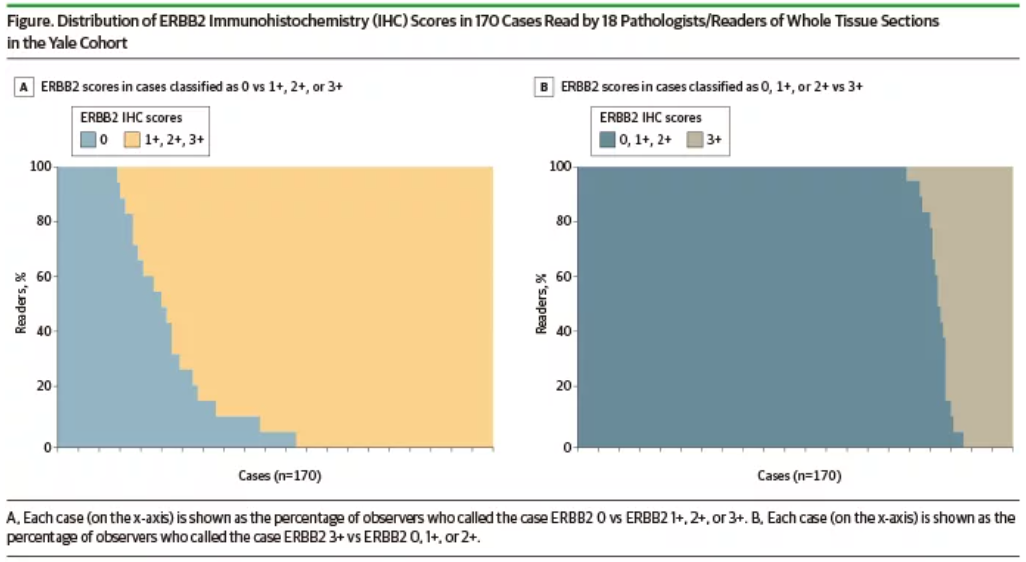结果显示,CAP调查数据显示18.75%(15/80)的病例由实验室读片得出HER2 IHC 0与1+一致率≤70%。耶鲁大学18位病理医师阅片的IHC 0和1+一致率仅26%,而2+和3+一致率为58%。