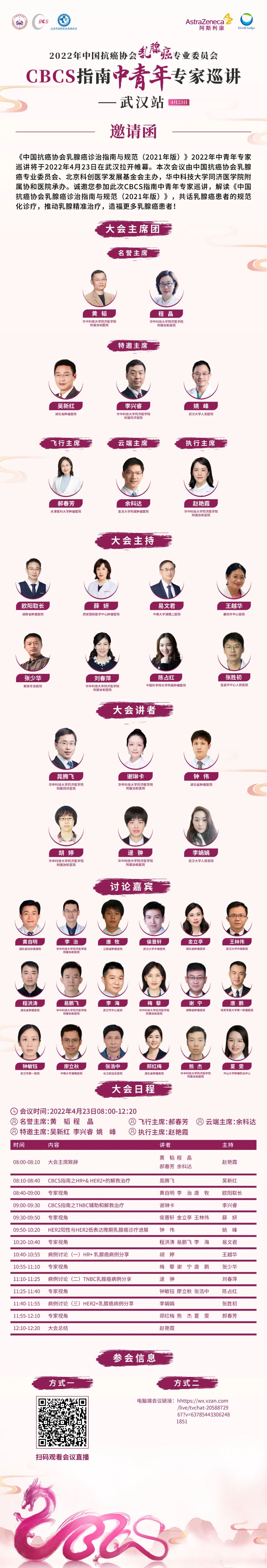 2022年中国抗癌协会乳腺癌专业委员会CBCS指南中青年专家巡讲——武汉站将于4月23日开启。