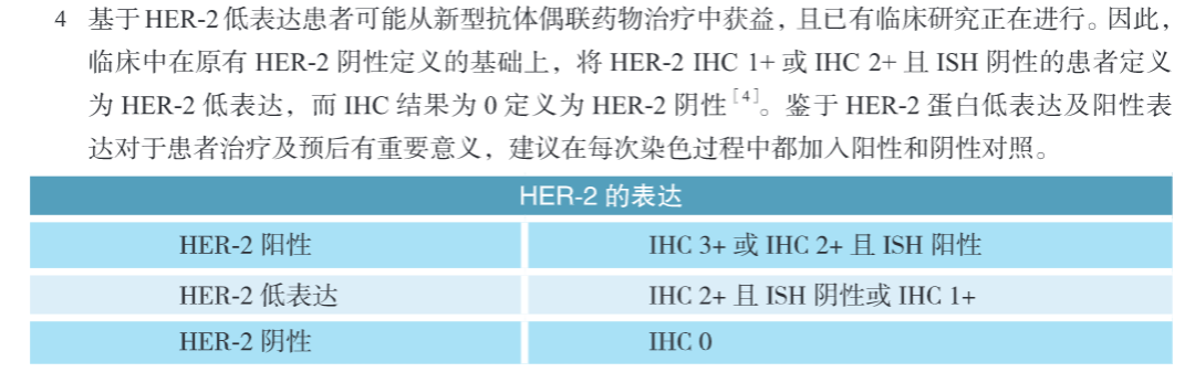 因此,在有临床研究数据支持的前提下,2021年我们对CSCO指南更新的时候特别指出HER2低表达这一概念。因为有HER2低表达的患者可能从抗HER2治疗的ADC药物中获益,并且有很多国内、国际上ADC药物的临床研究正在进行,我们需要第一时间告诉临床医生和病理科医生,HER2表达不再是二分法(HER2阳性和HER2阴性),现在我们应该将其分为HER2高表达、HER2低表达和HER2阴性,让这部分HER2低表达的乳腺癌患者也可以在临床研究和临床治疗中获益。