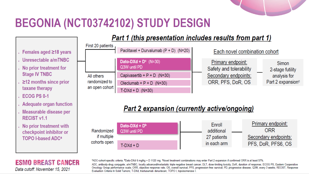 方法:纳入患者为适合一线治疗的不可切除a/mTNBC,且无论PD-L1/TROP-2状态如何,既往未经免疫检查点抑制剂或基于TOPO I的ADC治疗(其他入组条件见下图)。该研究的第一部分(Part 1)包括紫杉醇+度伐利尤单抗(P+D)、Dato-DXd+度伐利尤单抗(Dato-DXd+D)、Capivasertib(AKT抑制剂)+P+D、Oleclumab(CD73单抗)+P+D、T-DXd+D等5个队列;主要终点是安全性和耐受性,次要终点是ORR、PFS、DoR和OS。研究的第二部分(Part 2)为Ⅱ期扩展阶段,包括Dato-DXd+D和T-DXd+D两个治疗组;主要终点是ORR,次要终点是PFS、DoR、PFS6和OS。该研究的第二部分正在进行中,此处报告该研究第一部分中Dato-DXd+D队列的初步结果。该队列患者接受Dato-DXd 6 mg/kg+D 1120 mg静脉给药,每3周一次,直至疾病进展或出现不可耐受的毒性。此次分析的数据截止日期为2021年11月。
