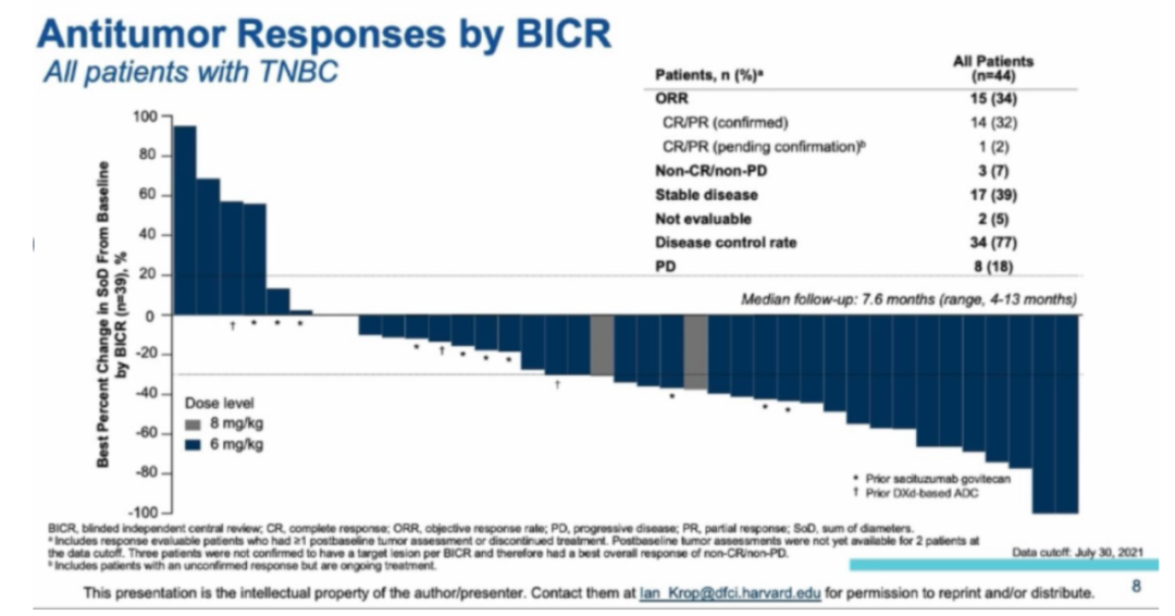 Ⅰ期TROPION-PanTumor01研究入组了44例接受过标准治疗后复发/进展的mTNBC(其中68%接受过≥2线治疗)。2021年SABCS大会报道的数据显示,Dato-DXd治疗的ORR为34%,疾病控制率(DCR)为77%;而既往未经过拓扑异构酶-I抑制剂为基础的ADC药物治疗的患者ORR和DCR则分别达到52%和81%。安全性表现良好,其中≥3级TEAEs率为23%(10/44)。