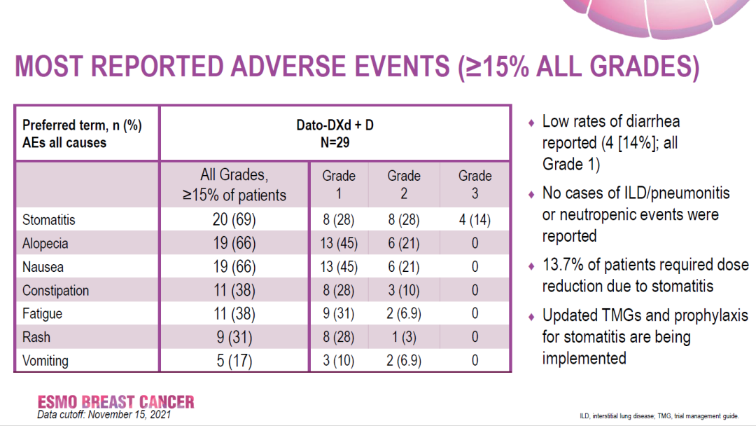 这项Ⅰb/Ⅱ期BEGONIA研究将Dato-DXd联合抗PD-L1抗体用于晚期TNBC一线治疗,初步数据显示ORR达到74%,且安全性良好,没有观察到剂量限制性毒性。