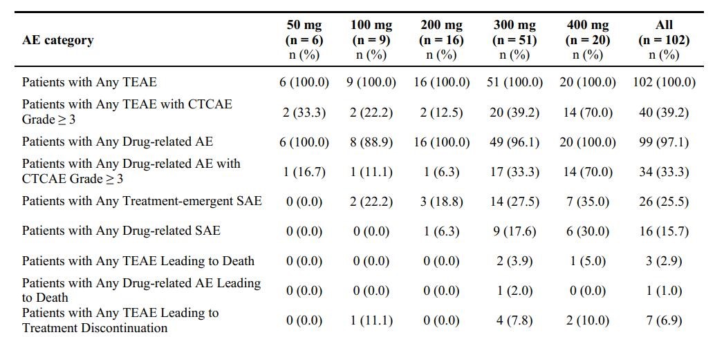 最终,从2019年9月至2021年4月,研究共纳入102例携带EGFR或HER2突变的患者,其中,国外人群54例,中国人群48例。在全部102例患者中,60.8%的患者携带EGFR第20外显子插入突变,在剂量爬坡阶段,研究共纳入5个爬坡剂量,分别为50 mg、100 mg、200 mg、300 mg、400 mg口服,每日一次。基于疗效、安全性、耐受性、药代动力学等数据,最终选择200 mg、300 mg及400 mg剂量进行进一步队列拓展,并分别纳入6例、28例和3例患者。