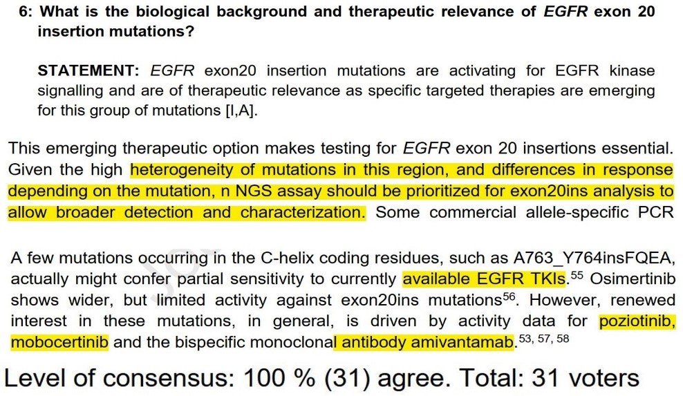 考虑到EGFR第20外显子插入突变的众多类型,而每一种类型的治疗可能存在不同,因此,指南推荐以NGS检测作为常规的检测手段,以涵盖不同的突变类型;推荐的治疗方案包括了一代TKI类药物(A763_Y764insFQEA突变类型)、TAK-788及ADC药物等。