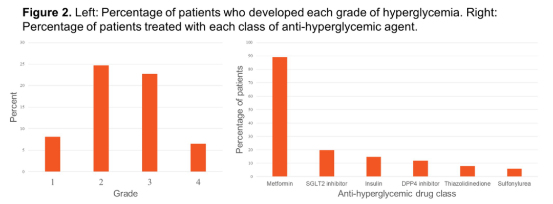 高血糖症出现的中位时间为服药后16天,体重指数≥25kg/m2或糖化血红蛋白水平≥5.7%能够有力地预测任何级别高血糖症(各组分别为P=0.036及P<0.001)及3-4级高血糖症的发生(两组均为P<0.001)。