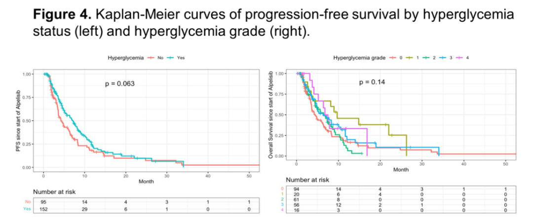 在发生高血糖症患者中,101例(40.9%)接受了降糖药物治疗,69例(27.9%)只接受了1种降糖药物而9例(3.6%)接受了超过3种降糖药物,而49例(19.8%)接受了内分泌科会诊。66例(26.7%)患者坚持服用阿培利司直至高血糖症消退;42例(17%)患者需要减少剂量,11例(4.5%)患者因高血糖症而停用阿培利司。高血糖症状态及血糖升高严重程度和无进展生存期无明显相关。
