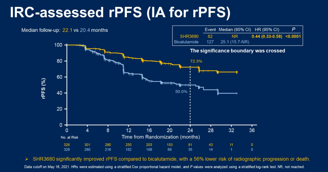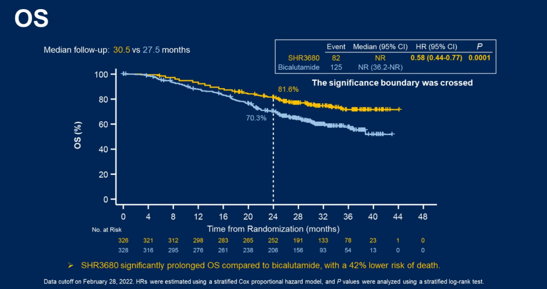 从研究数据可以看到,使用瑞维鲁胺(SHR368)的rPFS和OS的获益优于比卡鲁胺,这也是未来治疗转移性激素敏感性前列腺癌的一个非常好的选择。在CHART研究中,内脏转移亚组患者的获益不是很好,所以未来对于一些特殊的mHSPC患者,比如有内脏转移的,或者肿瘤负荷特别重的,以及一些体能状况好的年轻的病人,或许我们可以在SHR3680这类的药物基础上加上化疗或其他疗法,这可能会是一个更好的选择。