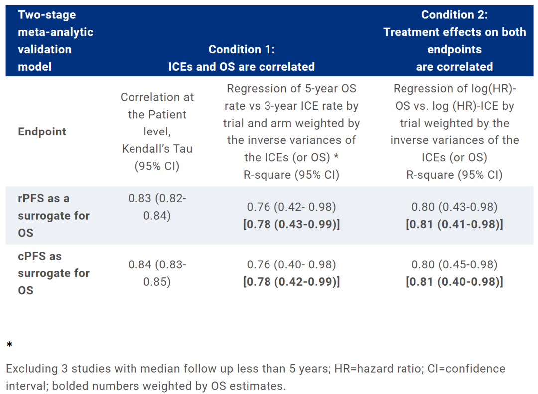 除此之外,MFS(肿瘤无复发生存时间)、PSA50(PSA下降大于50%)在临床中都能够比较好的评价疾病的治疗效果。未来我们也可以做一些相关的研究来证实PSA50或MFS和OS是否也有很好的相关性,或者使用其他指标来替代OS。但是目前阶段,我觉得还是PFS尤其是rPFS或cPFS,与OS的相关性会更好一些,这也是我们目前主要的有关替代指标的研究重点。