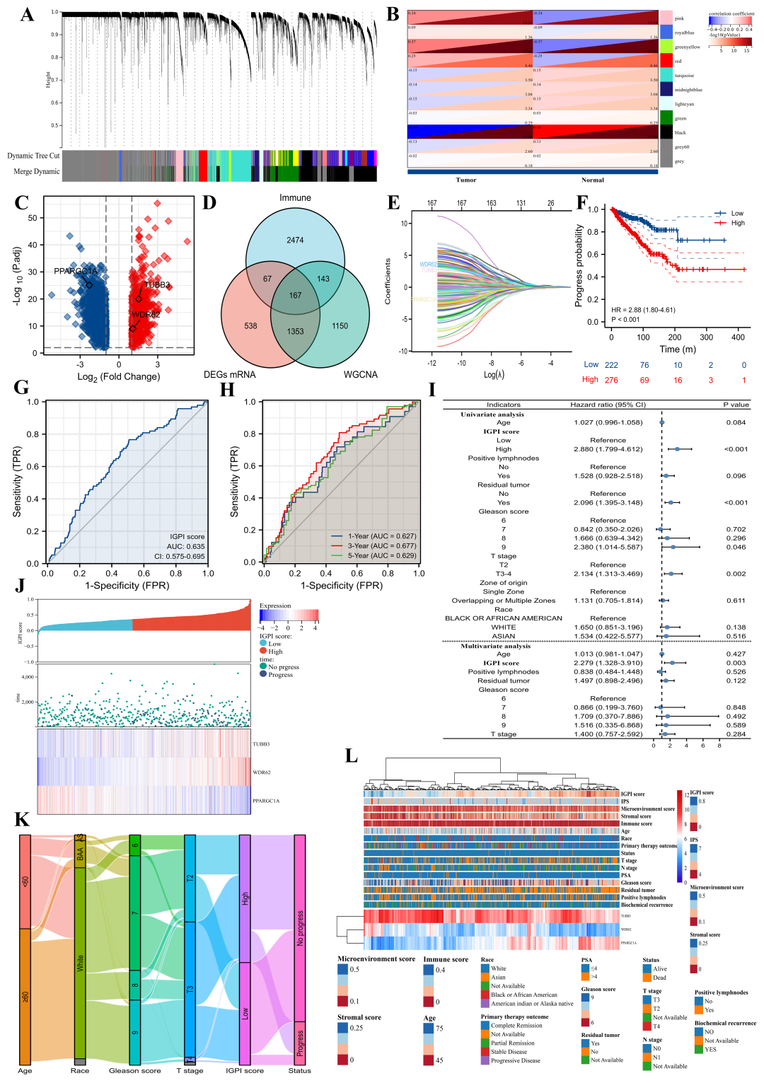 1. 最终鉴定出TUBB3、WDR62和PPARGC1A以建立IGPI评分。IGPI评分随着Gleason评分、肿瘤T分期、生化复发和前列腺特异性抗原(PSA)的增加而增加。在TCGA和两个GEO数据集中,IGPI评分较高的患者肿瘤进展的风险较高