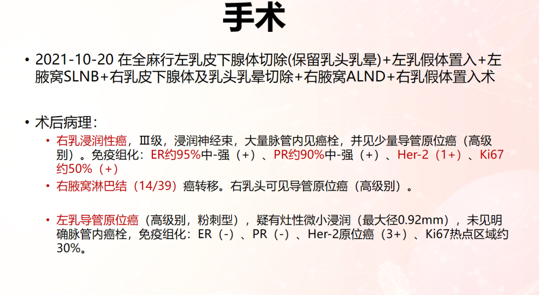 裴静教授:我认为该患者如果能在进行良好的沟通后接受新辅助治疗是更好的,因为该患者有14枚淋巴结转移(N3),术后需要进行放疗,放疗后如果进行假体植入,在包膜挛缩和乳腺外形方面都值得推敲。该患者淋巴结转移数量较多,因此进行强化治疗是非常重要的。由于该病例中患者为年轻女性,根据SOFT&TEXT研究,使用OFS联合AI是一个标准的治疗方案。另一方面,由于该患者淋巴结转移数大于4枚,根据Monarch E研究提示,加上CDK4/6抑制剂进行强化治疗是非常合适的。