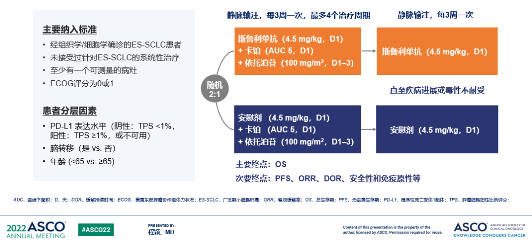 ASTRUM-005研究是一项随机、双盲、国际多中心、安慰剂对照的III期临床试验,旨在评价斯鲁利单抗或安慰剂联合化疗(卡铂+依托泊苷)用于广泛期小细胞肺癌(ES-SCLC)一线治疗的疗效和安全性。研究的主要终点是OS,次要终点包括PFS、ORR、DOR和安全性等。