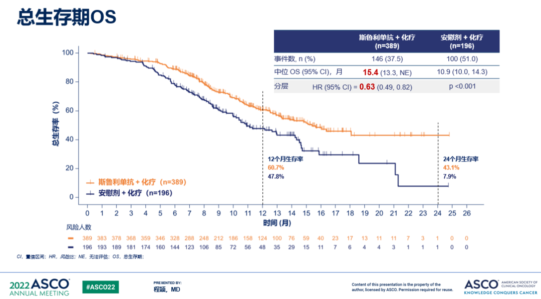 在ASTRUM-005研究的期中分析中,对照组中位OS 为10.9个月,斯鲁利单抗组15.4个月,HR=0.63(95%CI: 0.49-0.82),P<0.001,P值远远小于预设界值0.012。