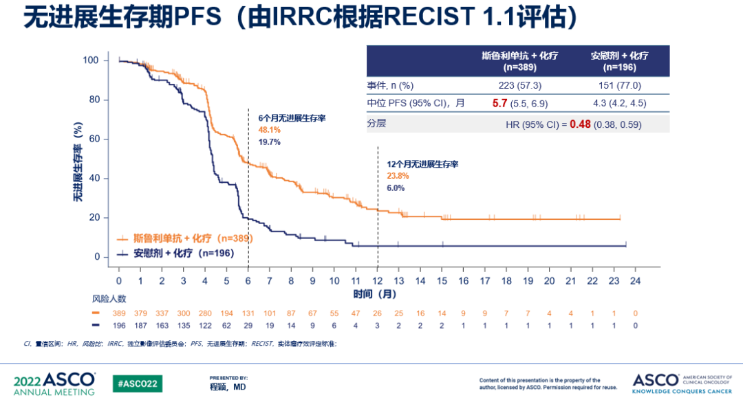 在PFS方面,对照组中位PFS为4.3个月,斯鲁利单抗组为5.7个月,HR=0.48(95%CI: 0.38-0.59),也观察到了明显的获益。