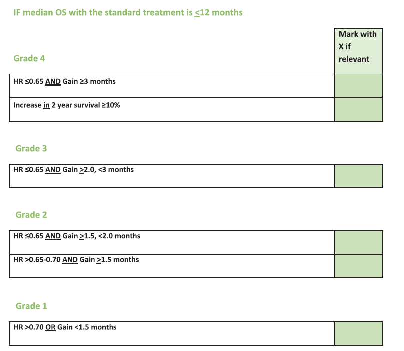 下图是ESMO的临床获益评价量表(ESMO-Magnitude of Clinical Benefit Scale version 1.1,MCBS1.1)。对于对照组中位生存期≤12个月的临床研究,在不考虑安全性和生活质量的情况下,药物的临床获益分为四个等级:Grade 1-4,4代表最高,1代表最低。达到Grade 4的要求需要满足以下两条中的任何一条:1)HR(置信区间下限,而不是点估计)≤0.65且中位OS延长≥3个月;2)2年OS率提高≥10%。