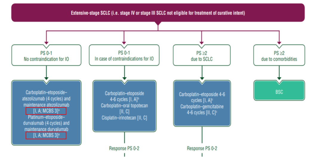 ESMO的临床获益评价量表目前已经广泛应用于ESMO的各大指南中,下图是ESMO的小细胞肺癌指南,其中度伐利尤单抗和阿替利珠单抗这两个PD-L1抑制剂都是I类推荐,证据级别是A级。后面还有“MCBS 3”的字样,表示基于ESMO MCBS1.1的量表。这两个方案的MCBS得分都是3分。