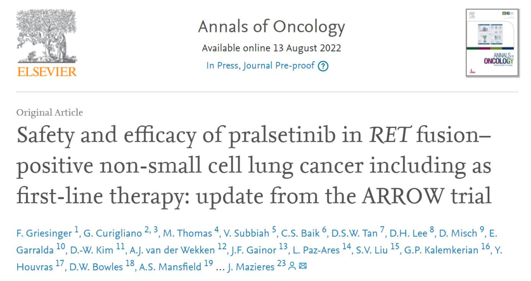 “钟”声“惠”言系列栏目4丨普拉替尼一线治疗携带RET融合的晚期非小细胞肺癌患者的疗效及安全性:ARROW研究更新