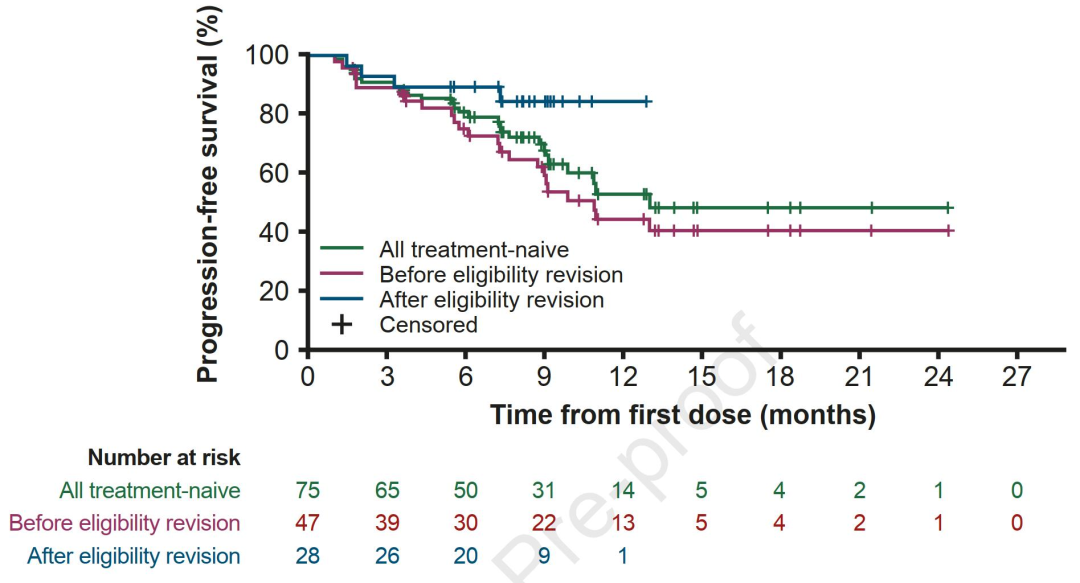 研究背景:1%~2%的晚期非小细胞肺癌患者携带RET融合基因突变,I/II期ARROW研究探索了普拉替尼在RET融合患者中的疗效及安全性,基于前期剂量探索数据,该药标准剂量为400 mg,口服,每日一次。肺癌队列中,在经治和初治患者中的ORR分别为70%和61%。由于初治患者均为不适合接受含铂双药治疗的患者,样本含量较少(29例),随后研究方案进行了修订,允许纳入全部的初治患者,以更好的代表真实世界的诊疗情况。本研究报道了全部的初治患者的疗效以及更新后的数据。