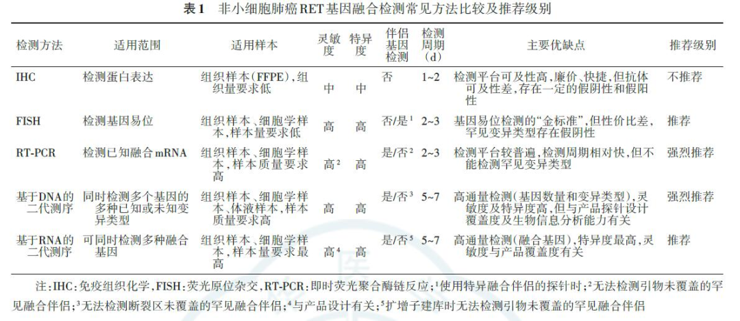 RET融合定义了一类特殊类型的晚期NSCLC患者,在NSCLC患者中,该突变发生率为1%-2%,不同种族之间的发生率未见显著差异,以女性、年轻、不吸烟及腺癌患者多见,目前已经发现50余种不同的融合类型,其中,以KIF5B?RET为最常见的RET融合亚型,约占所有RET融合的68.3%,其次为CCDC6?RET(16.8%)。在中国,该突变近年来也已经开始逐渐引起大家的重视。2021年的《中国非小细胞肺癌RET基因融合临床检测专家共识》推荐所有NSCLC患者进行基因RET融合基因检测,检测方法包括免疫组化(不推荐)、荧光原位杂交(推荐)、基于RNA的二代测序(推荐)、RT-PCT(强烈推荐)和基于DNA的二代测序(强烈推荐)。