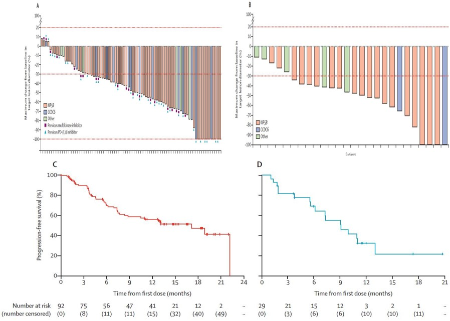 另外一款药物Loxo-292(塞尔帕替尼)同样展示了非常不错的疗效。其1-2期临床研究研究(即LIBRETTO-001研究)于2020年8月发表于《新英格兰医学杂志》。在1期研究中,患者接受20mg,每日一次至240mg,每日两次的Loxo-292治疗。在队列扩展或2期临床研究中,接受推荐剂量,即160mg,每日两次的Loxo-292治疗。49例患者入组1期剂量爬坡,56例患者入组2期队列扩展。对于经治患者,独立评审委员会评估的ORR为64%,中位PFS为16.5个月;对于初治患者,39例初治患者,独立评审委员会评估的ORR为85%,研究者评估的ORR为90%,患者中位持续时间及PFS尚未达到。