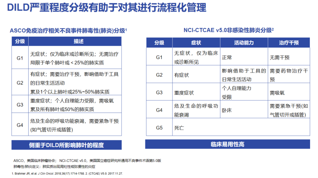 DILD缺乏特异性临床表现和体征,不同类型抗肿瘤药物引起DILD的疾病进程差异较大,可在用药后短时间内出现,也可缓慢发生,如在用药后数月发生。因此,对既往有肺部基础疾病的患者,在使用抗肿瘤药物过程中,若出现原有呼吸系统症状和/或体征加重,需排查DILD。胸部高分辨CT是评估DILD及随诊观察的重要手段,血液检查、血气分析、肺功能检查等也可以作为辅助诊断。对于疑似DILD患者,应尽早行气管镜检查并酌情行病理活检。开始抗肿瘤治疗前,可进行胸部影像学与血液学检查排查重要危险因素,治疗中应综合考量权衡获益-风险选择肺毒性风险较低抗肿瘤药物,密切监测呼吸系统症状体征。对于出现DILD的患者,DILD严重程度分级有助于对其进行流程化管理。