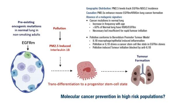 研究涉及447,932人,目的是确认PM2.5浓度与癌症风险之间的关联。研究人员对247个正常肺组织小样本进行了最先进的超深突变分析,并分别在15%和53%的正常肺样本中发现了EGFR和KRAS驱动突变。EGFR和KRAS基因的驱动突变可能是衰老的结果,并且实验室模型显示其增加癌症风险的作用微弱。然而,当具有这些突变的肺细胞暴露于空气污染物时,癌变速度相比其未暴露于污染物时更快,这表明空气污染促进了巨噬细胞反应和存在EGFR突变的肺上皮细胞中的祖细胞样状态。这些实验室研究结果促使一个问题被提出,即这些数据能否为新的基于分子的预防策略以及为存在肺癌风险的非吸烟者(即携带EGFR突变者)开发靶向治疗铺平道路。