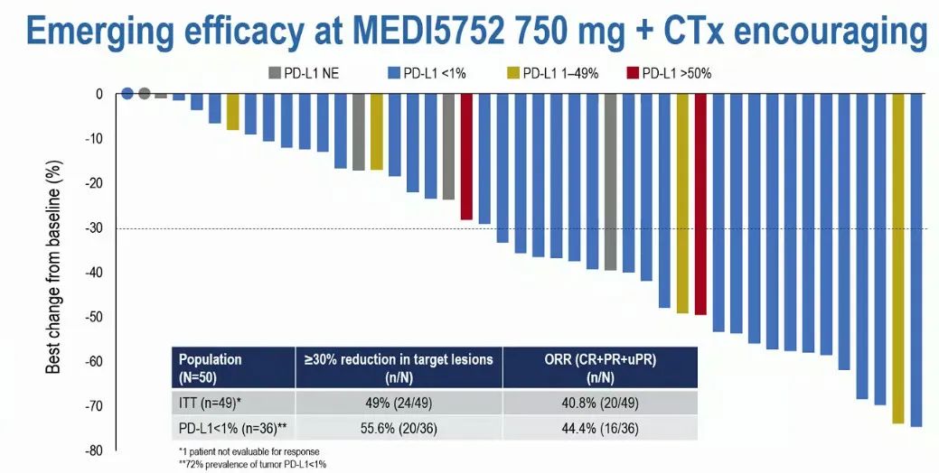 因此,MEDI5752 750mg联合化疗为NSCLC一线治疗提供了潜在的治疗选择,尤其是PD- L1阴性患者,但仍需更长的随访时间来进一步确证疗效。