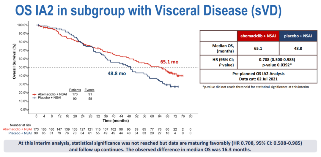 MONARCH 3是一项随机、双盲、安慰剂对照的Ⅲ期临床研究,于2014年11月至2015年11月在22个国家的158个中心开展,共纳入了493例患者,患者以2∶1的比例随机分配至阿贝西利+NSAI组(n=328)和安慰剂+NSAI组(n=165)。该项研究详细的研究信息,包括研究主要终点PFS已公布(Goetz,JCO 2017)。OS是一个关键的次要终点,预设的第二次中期分析(数据截止至2021年7月2日)OS数据是在意向性治疗(ITT)人群中252例事件发生之后(80%计划事件用于最终的OS分析),最终的OS分析要求ITT人群至少发生315例事件,在内脏转移(sVD)亚组人群中至少发生189例事件,截止时间为2023年。使用分层log-rank检验并应用预定义的误差来分析ITT人群和内脏疾病(sVD)亚组OS获益的显著性。