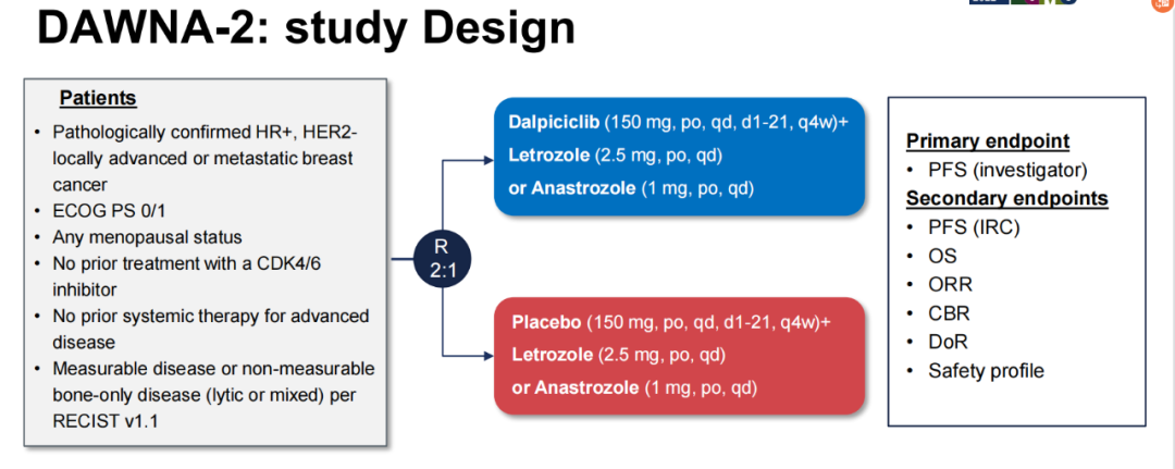 一项Ⅲ期试验:达尔西利联合来曲唑或阿那曲唑用于HR+/HER2-晚期乳腺癌(DAWNA-2)患者的一线治疗