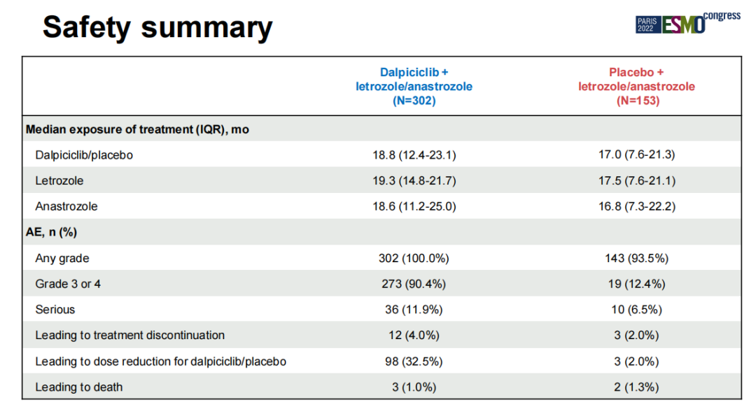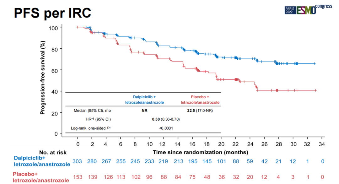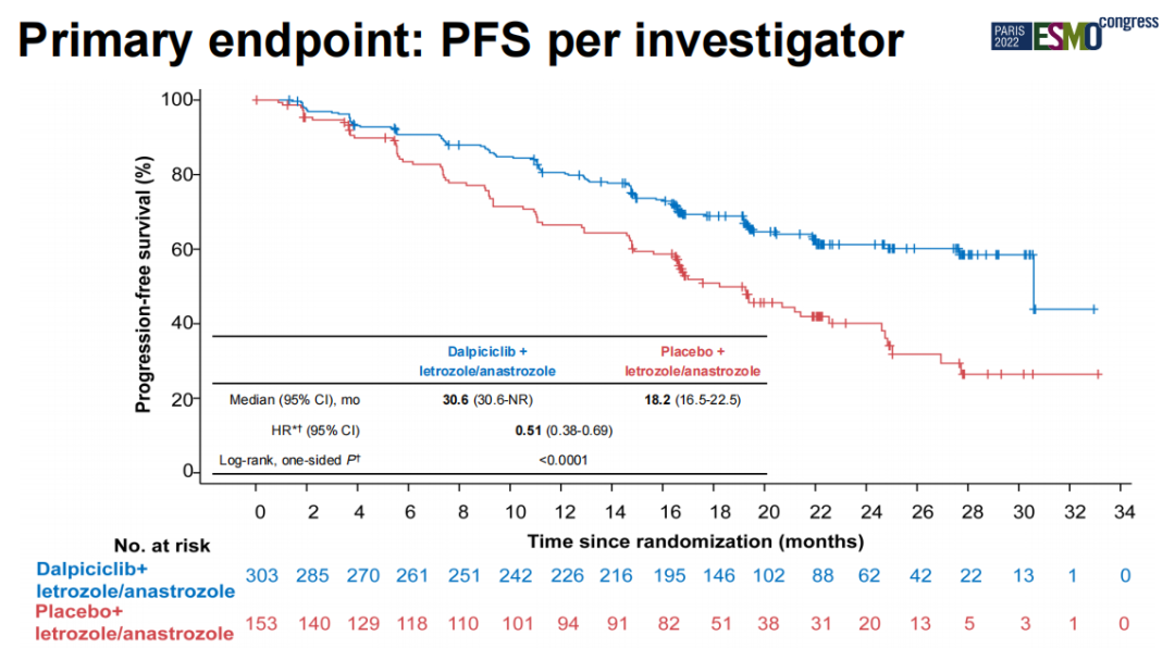 456例患者随机分为达尔西利+来曲唑/阿那曲唑组(N=303)或安慰剂+来曲唑/阿那曲唑组(N=153)。中位随访时间分别为21.7和21.4个月,与安慰剂组相比,达尔西利组每位研究者的PFS显著改善(中位PFS,30.6个月[95%CI:30.6~NR]vs 18.2个月[95%CI:16.5~22.5];HR 0.51[95%CI:0.38~0.69],单侧P<0.0001)。无论绝经状态如何,达尔西利的PFS获益都很显著。每位患者的客观缓解率(ORR)和反应持续事件(DoR)在达尔西利组中也有更好表现。