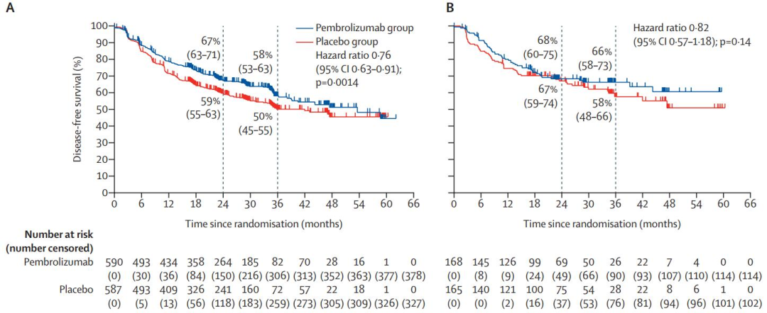 在整体人群中,免疫治疗组和安慰剂组分别有36%和44%的患者出现终点事件。中位DFS分别为53.6个月和42.0个月,HR=0.76,P=0.0014,两组分别有17%和19%的患者出现死亡事件,中位OS均未达到,HR=0.87;在PD-L1≥50%的人群中,两组分别有32%和38%的患者出现终点事件,中位DFS在两组均未达到,HR=0.82,P=0.14。
